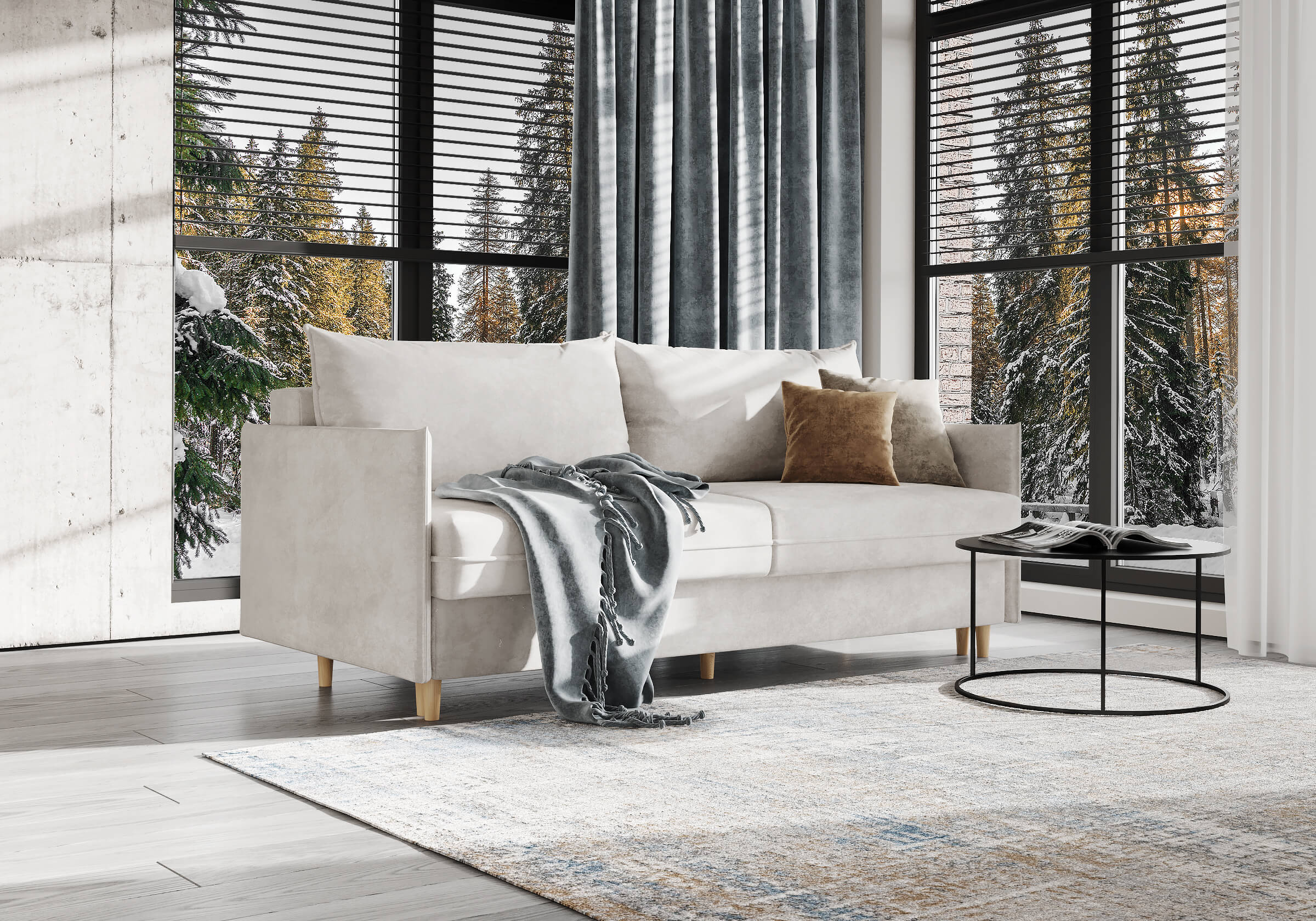 Диван для сна в скандинавском стиле с механизмом трансформации пантограф и коробом для хранения. Модель без броского декора, с прямыми линиями. Благодаря декоративному канту на сидении, подлокотниках и подушках, а также опорам из натурального массива Rain органично впишется в современные интерьеры в скандинавском стиле. У дивана анатомический матрас с блоком независимых пружин, жесткость средняя. Тонкие подлокотники делают диван негабаритным в длину. Комфортная глубина и высота сиденья обеспечит ежедневный комфорт. Задняя спинка предотвращает загрязнение и повреждение стены. В основе мягких подушек – микс наполнителей: поролоновая крошка не дает деформироваться, а синтетическое волокно добавляет комфорт. Опоры деревянные, два цвета на выбор. Просвет над полом способствует легкой уборке под диваном, в том числе роботом-пылесосом..