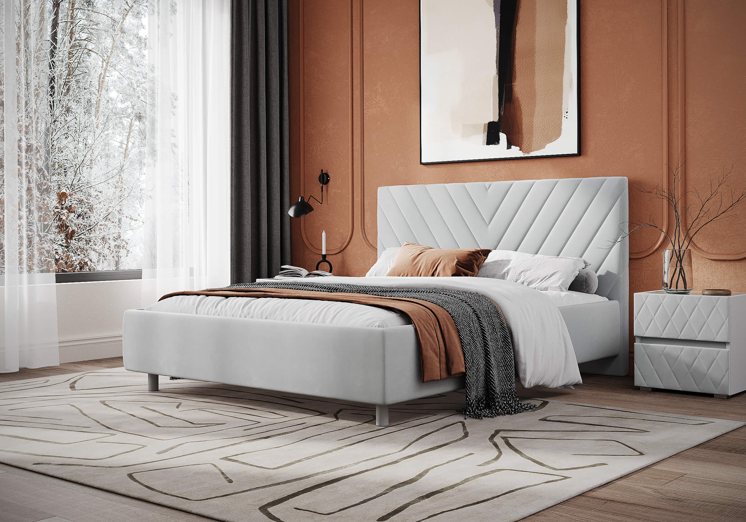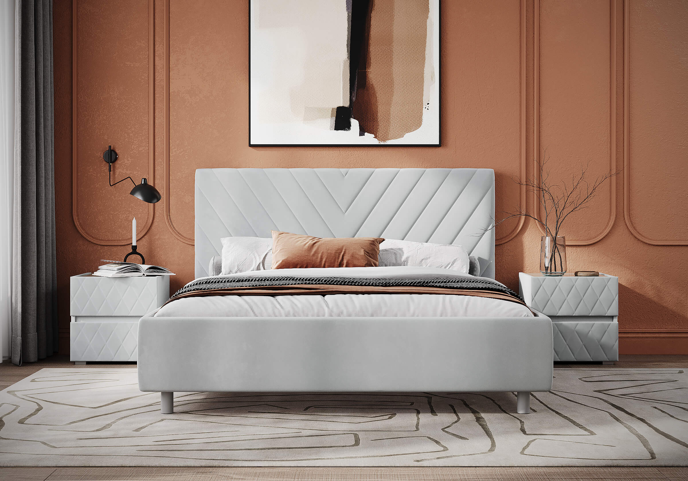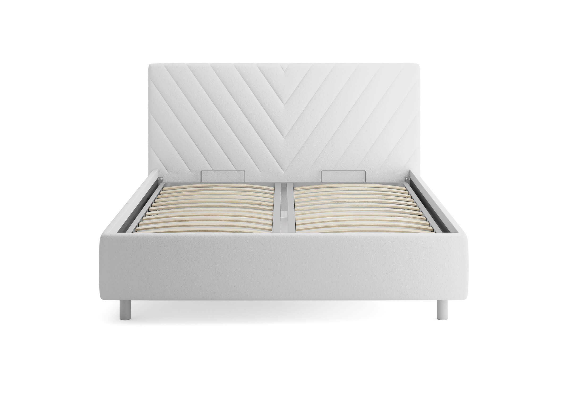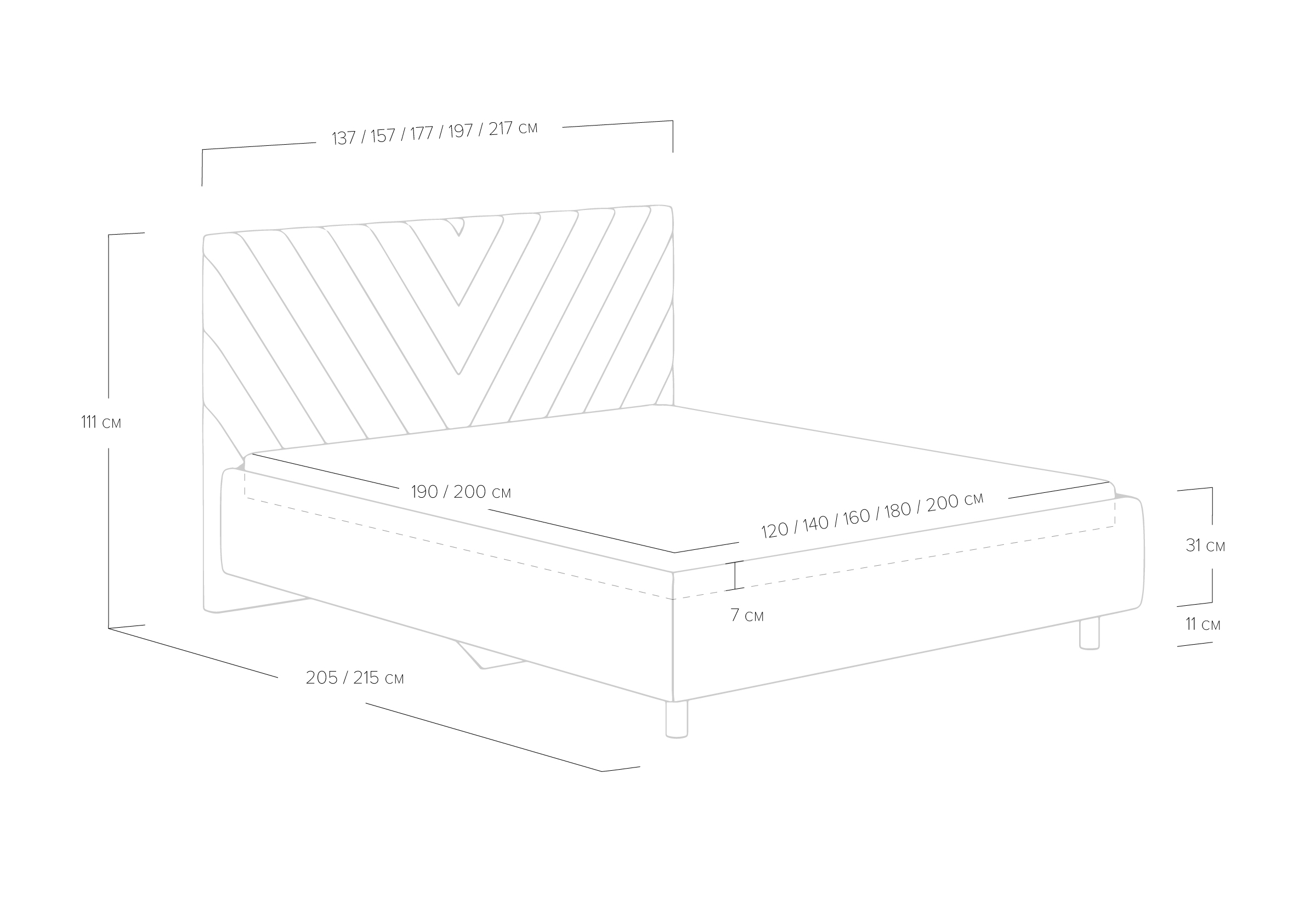 Кровать с мягким стеганым изголовьем, украшенная элегантными геометрическими линиями, придаст изысканность и уют спальному месту. Отлично впишется в большинство современных интерьеров. Увеличенный просвет от пола позволяет облегчить уборку под кроватью, в том числе роботом–пылесосом. Царги кровати выполняются по технологии съемного чехла. При необходимости кровать может быть укомплектована разборным или неразборным металлическим основанием с ламелями, подъемным механизмом с бельевым ящиком, трансформируемым основанием Aquarius.