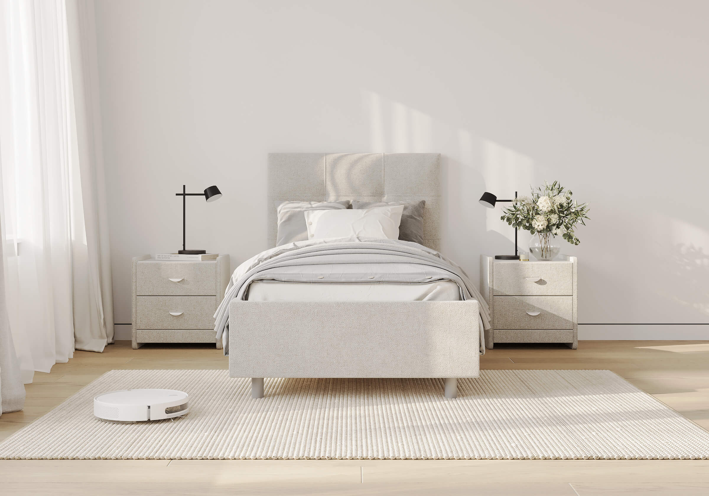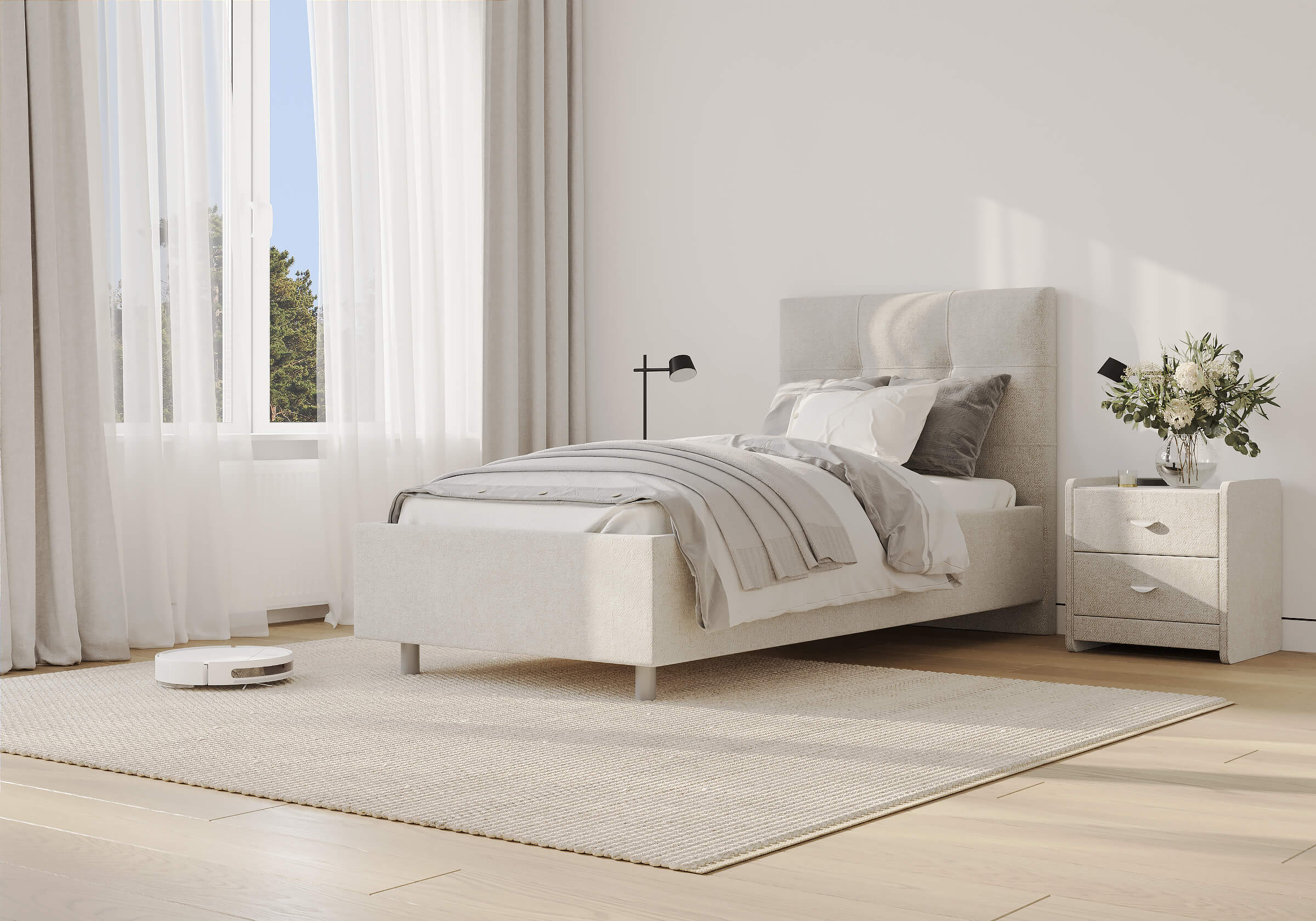 Основание кровати на металлических опорах. Благодаря увеличенной высоте позволяют осуществлять легкую уборку под кроватью, даже с помощью робота-пылесоса.
