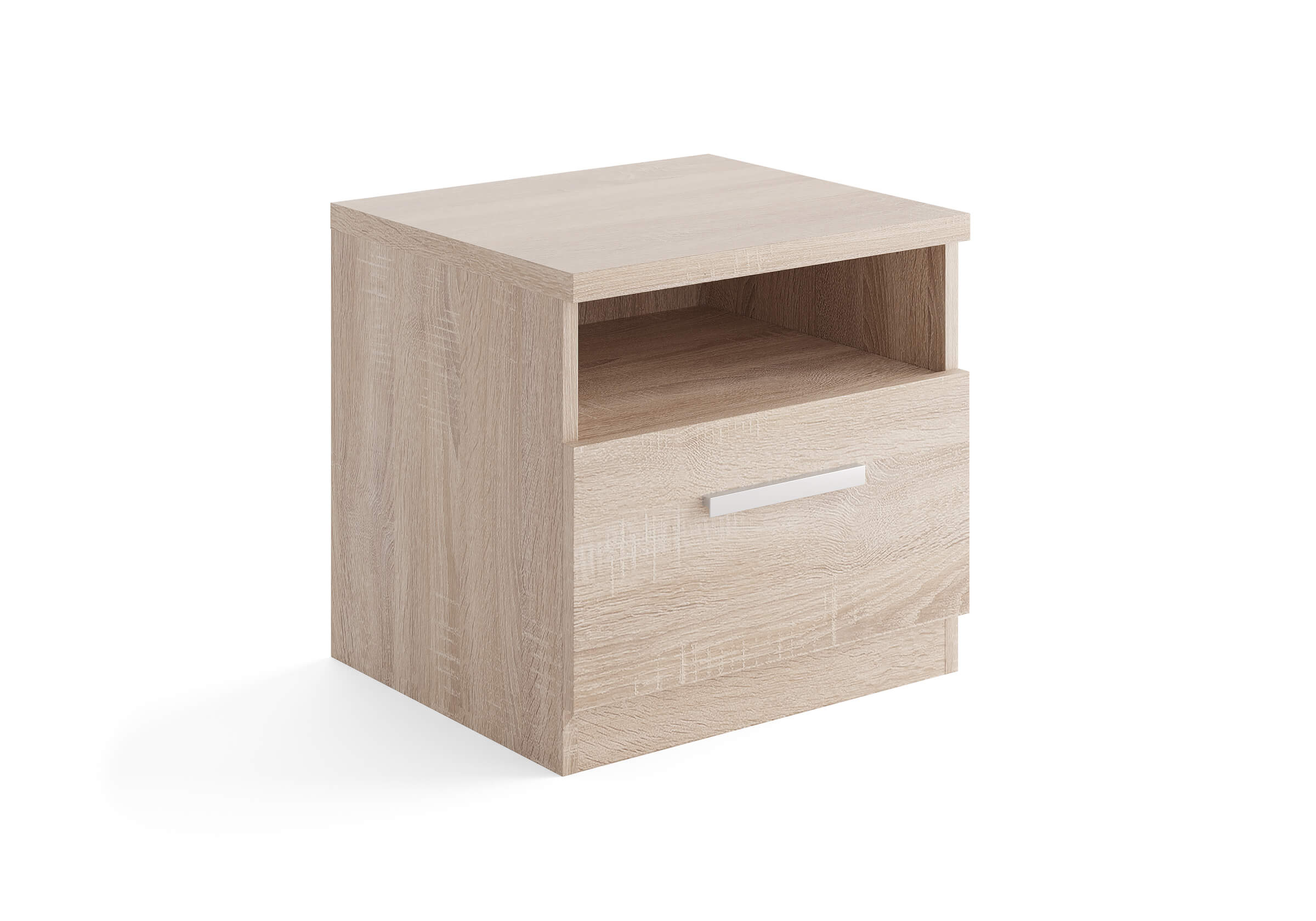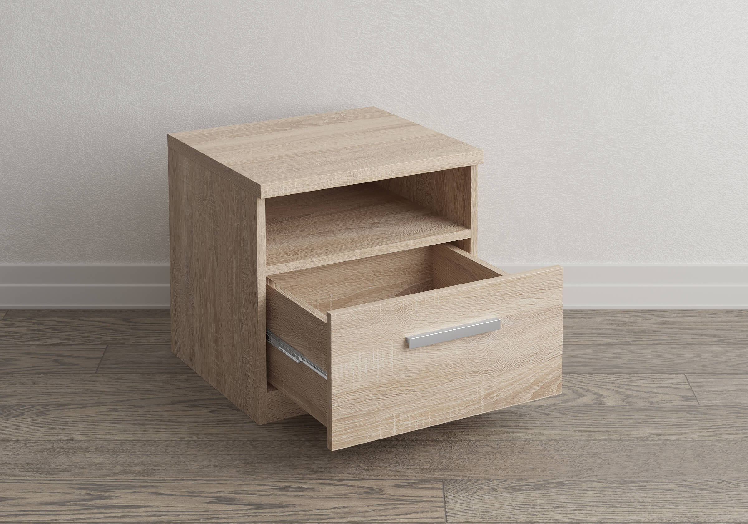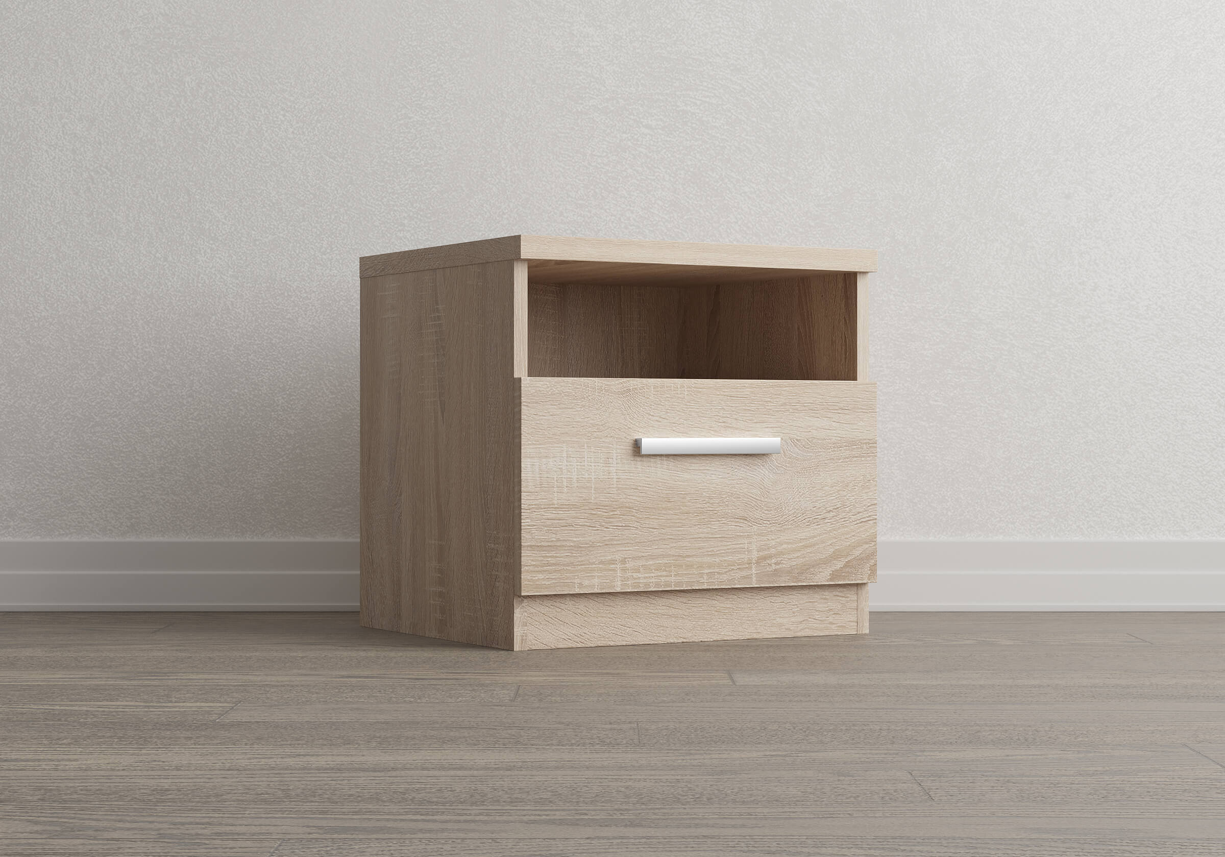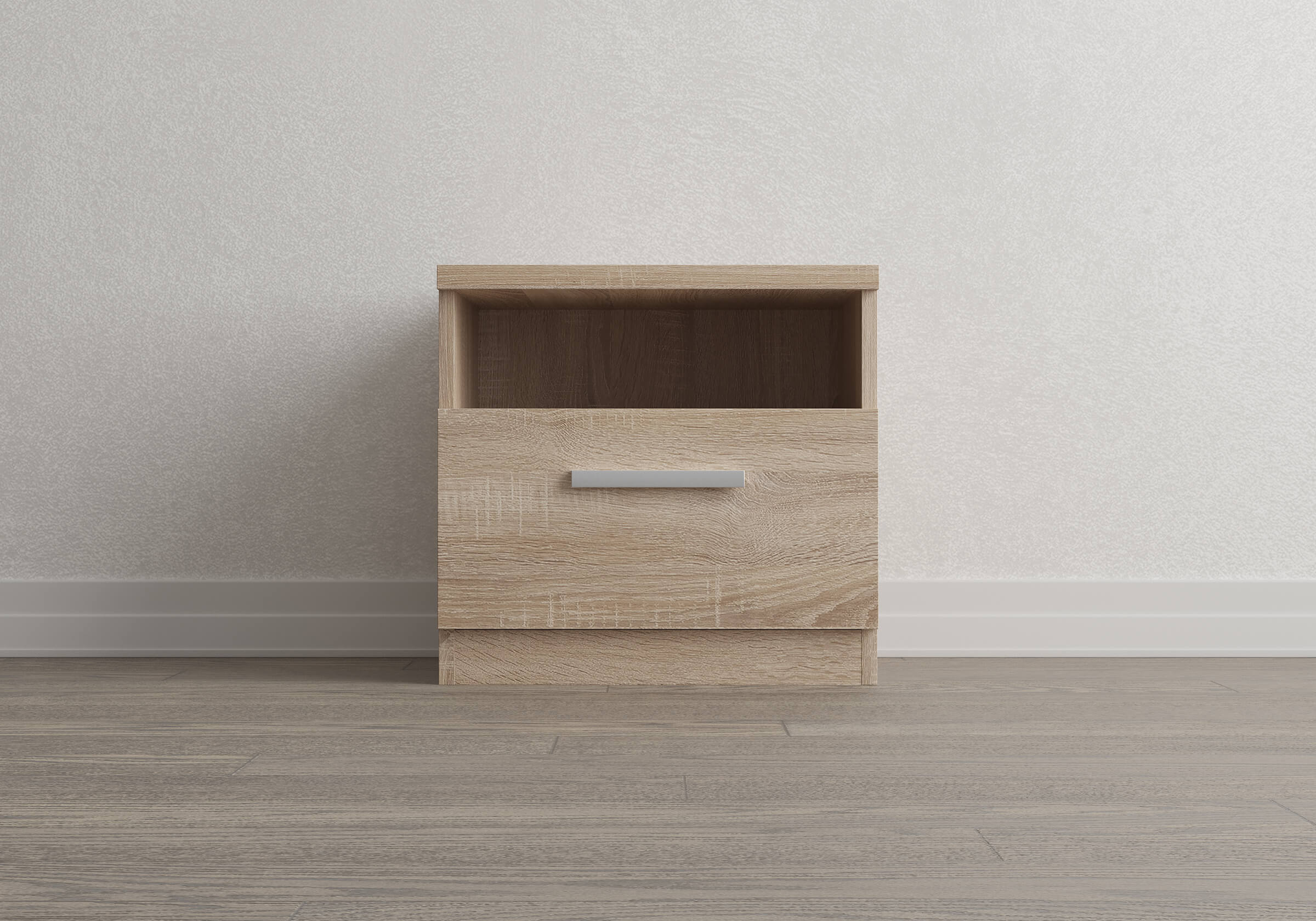 Прикроватная тумба с одним выдвижным ящиком и нишей сочетается с любыми моделями кроватей. Прямые углы, лаконичные  металлические ручки, увеличенная толщина плиты ЛДСП 25 мм. Шариковые направляющие без доводчика. Стильная и практичная тумба прекрасно дополнит собой любой интерьер.