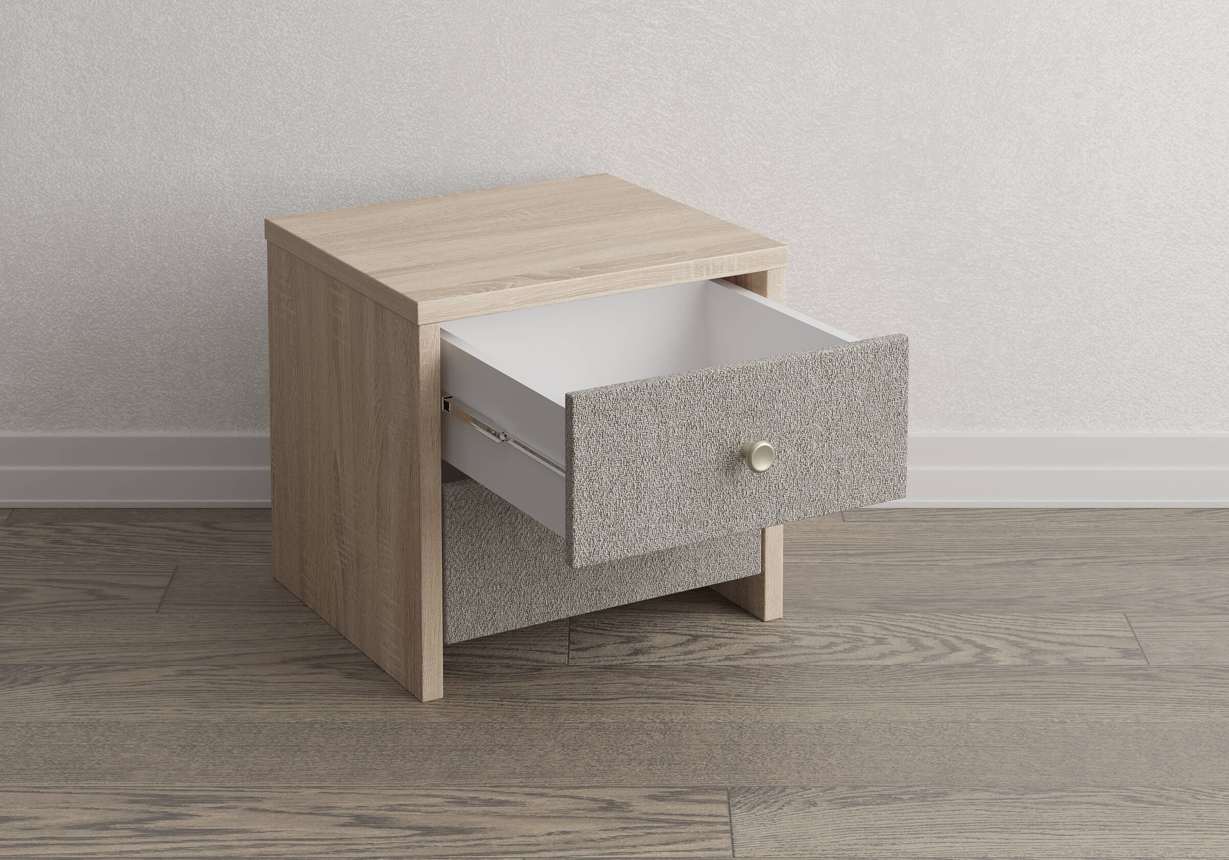Прикроватная тумба с выдвижными ящикам сочетается с любыми моделями кроватей. Прямые углы, лаконичные  металлические ручки, увеличенная толщина плиты ЛДСП 25 мм. Шариковые направляющие без доводчика. Фасады выдвижных ящиков выполняются в любой ткани на выбор. Стильная и практичная тумба прекрасно дополнит собой как кровать в полностью мягком исполнении, так и для комбинированных моделей из мягкого изголовья с ламинированными царгами.